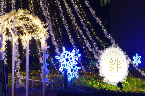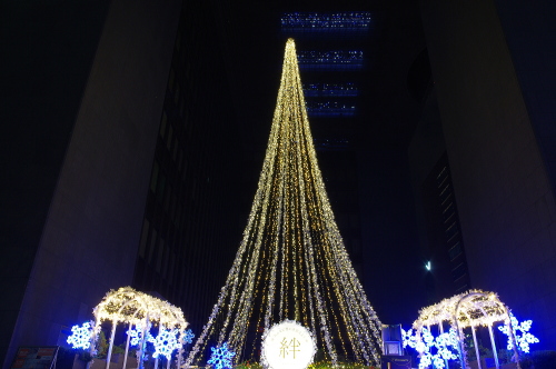 福岡の商業中心地・天神にある福岡銀行本店では、「絆」をテーマに約2ヵ月間ツリーやモニュメントが飾られています。ベンチがあるので、ゆっくり座ってイルミネーションを観賞できます。
