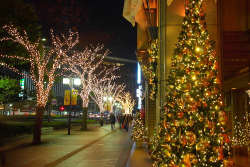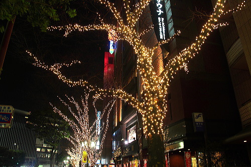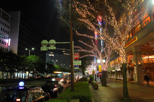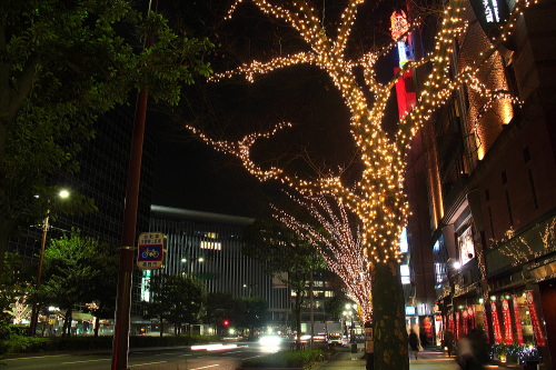 ホテル日航福岡のクリスマスツリーと大博通りのイルミネーション。