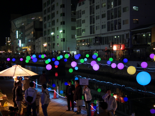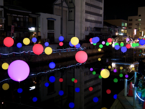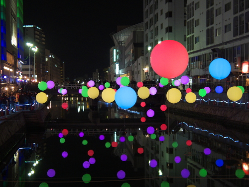 | 博多川に浮かぶイルミネーションバルーン。 |