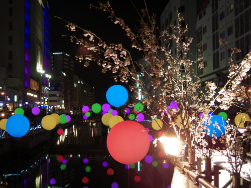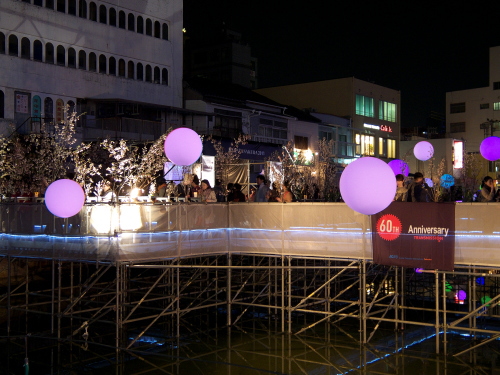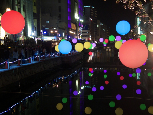 | 福岡青年会議所60周年記念事業として、博多川にイルミネーションバルーンを浮かべて幻想的な雰囲気を出し、水上BARや音楽ステージ・芸術作品などの展示イベント「Hakata Sakura 2013」がリバレイン近郊から博多橋までの間の博多川で開催されました。 |