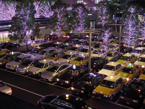 | 順番待ちのタクシーの列。 |