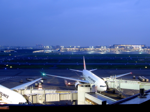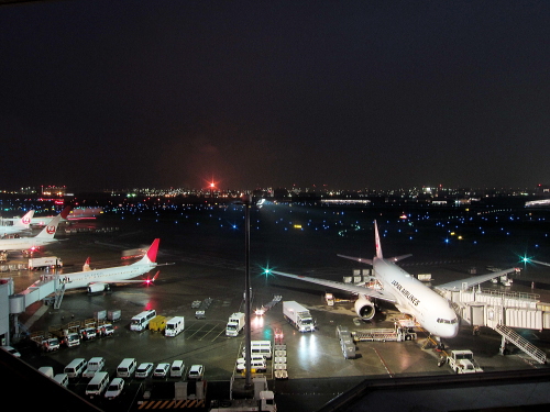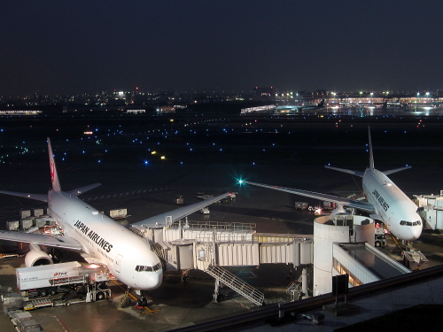 | 羽田空港第1旅客ターミナルの最上階には展望デッキがあり、羽田空港に着陸する飛行機を眺める事ができます。JALの旅客機・滑走路の誘導灯・国際線ターミナルと遠くに川崎の工場群の灯りを眺める事ができ、展望デッキの雰囲気も優れています。羽田空港の利用の際、搭乗時刻までの時間潰しにはいいと思います。 |