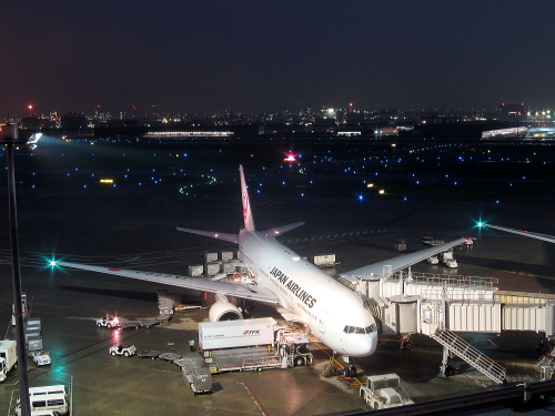 | JALの旅客機と滑走路の誘導灯を望む。 |