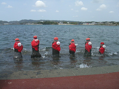 | はらほげ地蔵は、六道(地獄・餓鬼・畜生・修羅・人間・天)において衆生の苦患を救うという六種の地蔵であります。海女で有名な八幡浦の海中に祀られていて、自然石の頭部で腹が丸くえぐられているので、はらほげ地蔵と呼ばれています。 何時誰が、何のために祀ったかはっきりしたことは不明で、遭難した海女の冥福のため鯨の供養慰霊のためなどと伝えられています。胸の穴は、満潮になって地蔵が水没しても供え物が流れないように、船から供え物ができるように、あるいは流行の疫痢の疫病退散祈願のためなどと言われています。 |