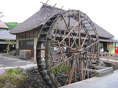 | 原尻の滝に併設されている飲食店と水車。 |