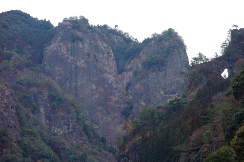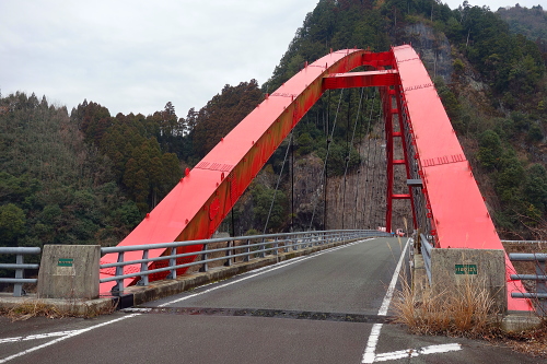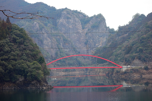 | 日向神ダムと赤い「けほぎ橋」の背後にハート岩。 |