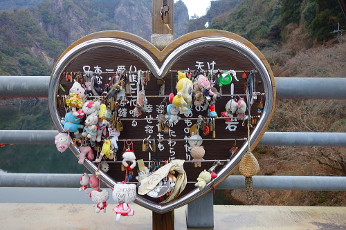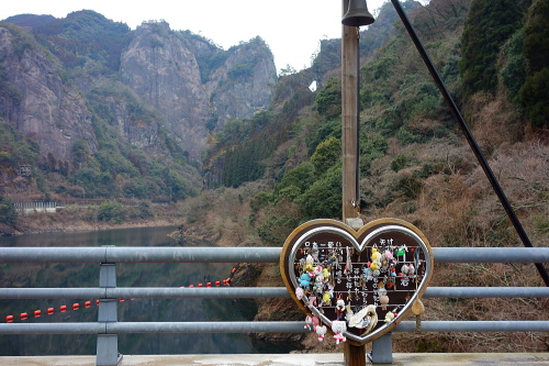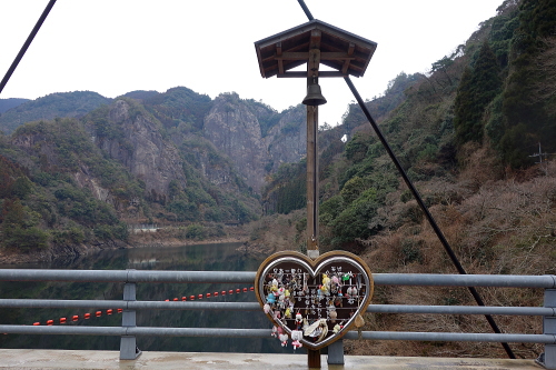 | 八女市矢部村の人造湖である日向神ダム湖に架かる「けほぎ橋」には、幸せの鐘と記念のプレートがあり、ここからはハート岩をより近くではっきり眺めることができます。この「けほぎ橋」が架かる道は県道に指定されていますが、道幅が狭く車同士のすれ違いには厳しい道ですので、通常時には注意が必要です。 |