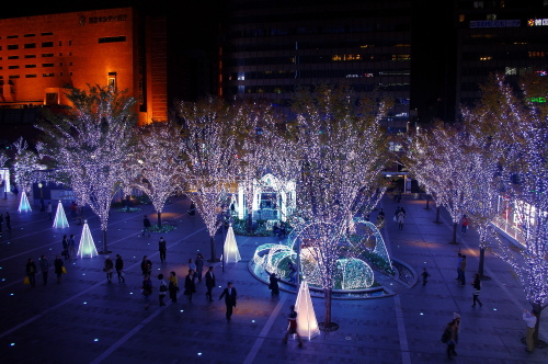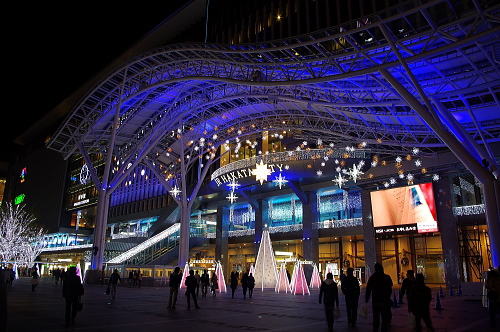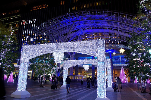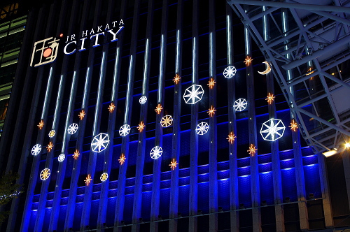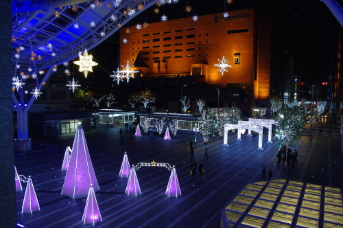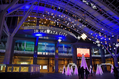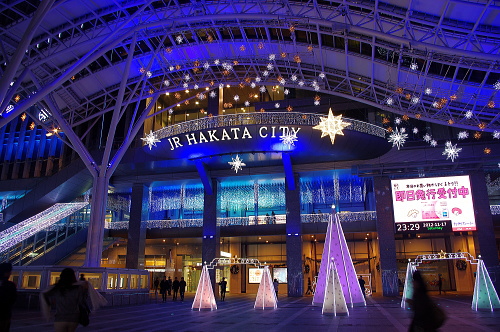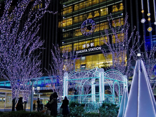 | 福岡の玄関口であるJR博多駅では、約70万個のLED電球を使用したイルミネーション「光の街・博多」が開催されます。昨年行われた「冬のファンタジー・はかた’12」とは大幅に変わってはいないものの、2階のペデストリアンデッキはオーロラをイメージした動くイルミネーションになっていて、美しいイルミネーションを鑑賞する事ができます。 点灯期間:2012年11月16日〜2013年1月15日まで 点灯時間:17:00〜24:00 |