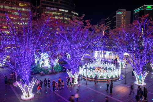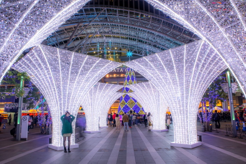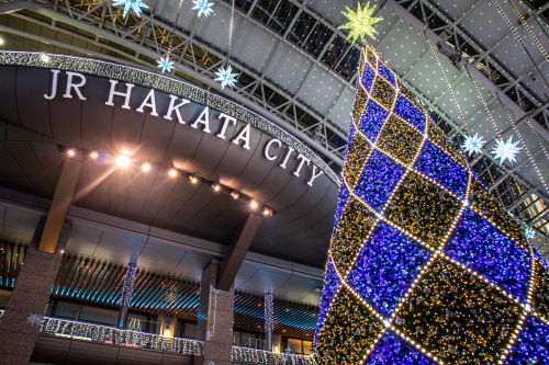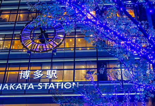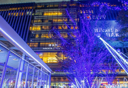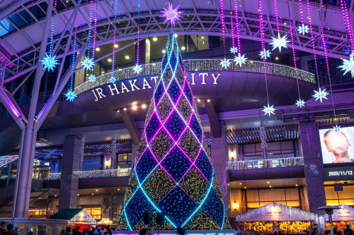 | 福岡の玄関口であるJR博多駅では、約80万個のLED電球を使用したイルミネーション「光の街・博多」が開催されます。昨年のイルミネーションとは大幅に変わってはいないものの、時間の経過により電球の色が変化していきます。博多駅前広場に設置された高さ14.9mの「光の塔」が、美しいイルミネーションを観賞する事ができます。 2020年のコンセプトは「星空のサイレントエール」という事で、大屋根一杯に星空を描き、新しい星空と光の街・博多を飾る一粒一粒の小さな光がサイレントエール(静援)となってこの街全体に降り注ぐ様な光のエールを送りますとの事です。 点灯期間:2020年11月5日〜2021年1月6日まで 点灯時間:17:00〜24:00 |