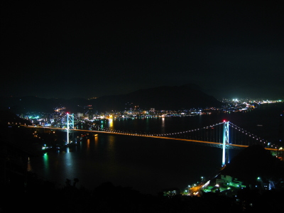 | 下関市の中心街から車で約30分弱で行ける火の山公園は、中四国三大夜景の一つとして、夜景がとても美しい展望所です。関門橋を中心として、下関市街・対岸の門司市街など、広範囲のパノラマ夜景を観賞できます。火の山展望台がありますが、室内の蛍光灯が明るくて観賞しにくいのですが、展望台から少し下ったロープウェイ上駅隣の展望所からがベストポイントです。 |