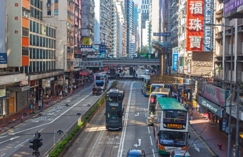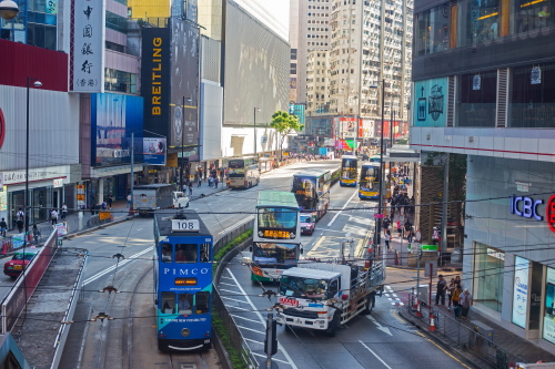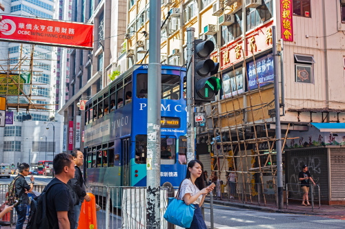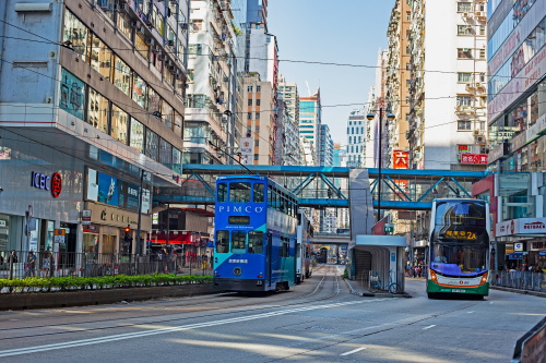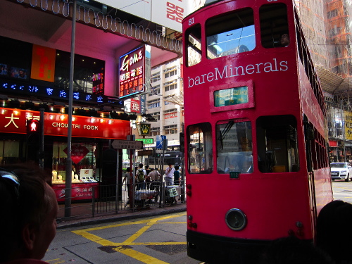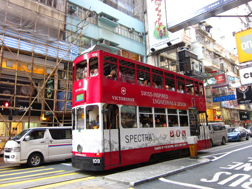 | 銅鑼灣を走るトラム。香港島での手軽な公共交通機関。 |