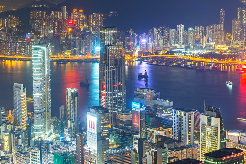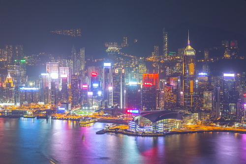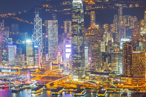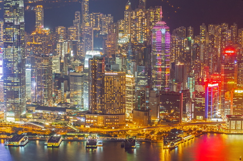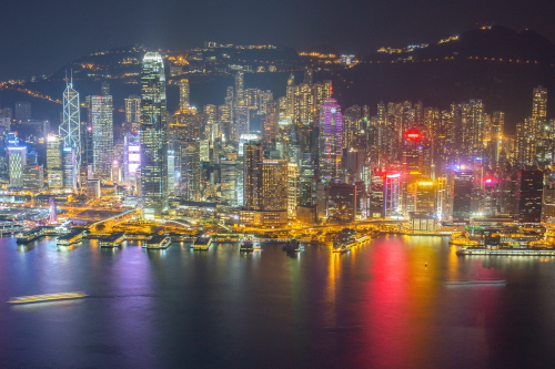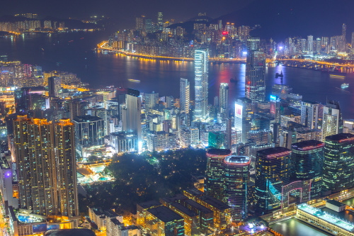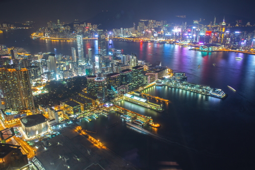 | Sky100展望台から香港島・中環の超高層ビル群を望む。 |