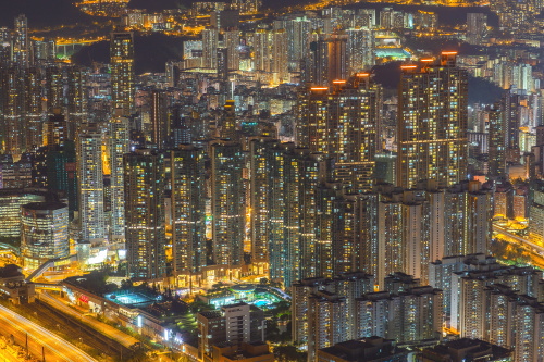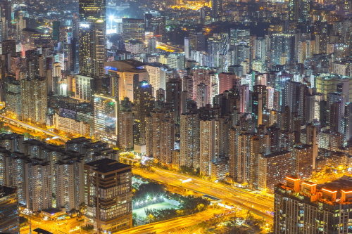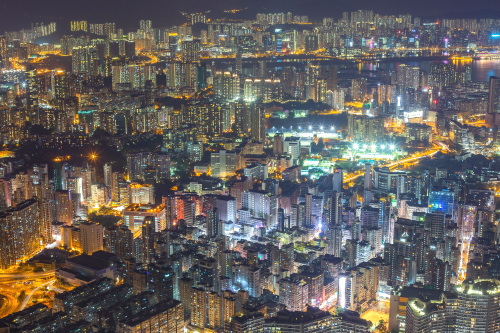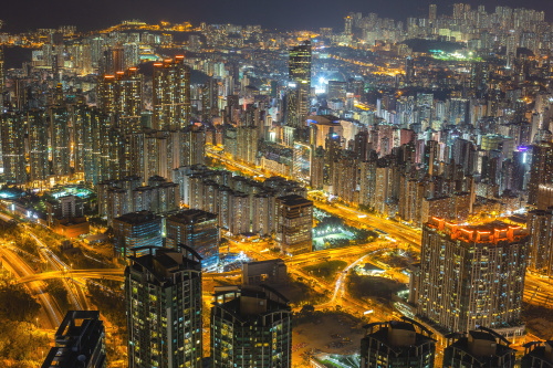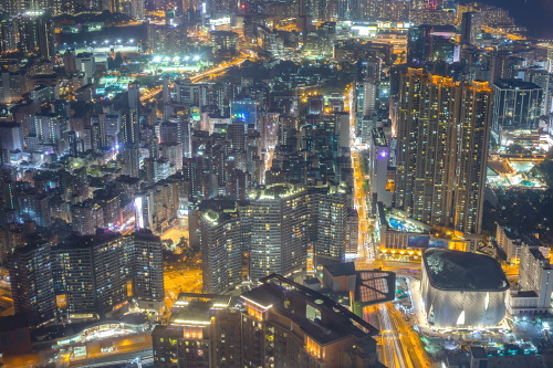 | Sky100展望台から旺角・大角咀方面の高層ビル群を望む。 |