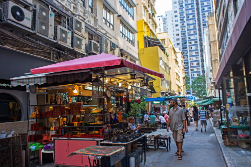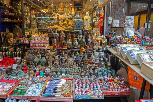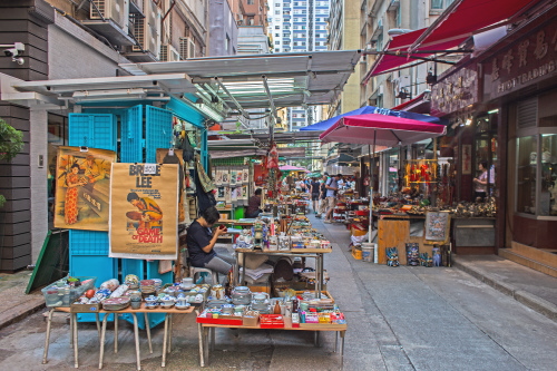 | 摩羅上街は別名キャット・ストリートと呼ばれ、ここには高価な骨董品やそのレプリカ等、普通のお土産屋では販売されていない商品を販売しているお店が軒を並べています。「摩羅」とは香港人がインド人を指す言葉で、英国植民地の時代にはインド人コミュニティが形成されて摩羅街と呼ばれるようになり、インド人がここでアンティークや中古品を販売していましたが、マーケットが広がって盗品を売る店がたくさん出てきたらしく、香港では盗品を「ねずみ商品」と呼ぶ事から、それを買うために群がる人たちを「ネコ」に例えるようになり、やがて「ネコが集まる通り」ということでキャットストリートと呼ばれるようになったのが由来だそうです。 |
