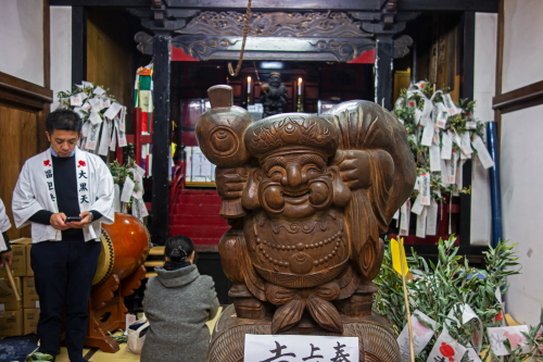 本堂内に安置されている大黒像は、宝満山奥之坊より持ち込んできたものらしく、毎年12月2日と3日は「大黒天福迎祭」が開催され、木造大黒天像が開帳されます。ぜんざいの接待付き700円の福引があり、参拝客で賑わいます。 |