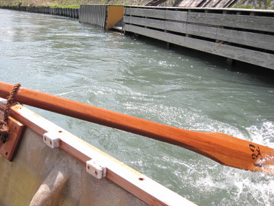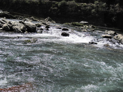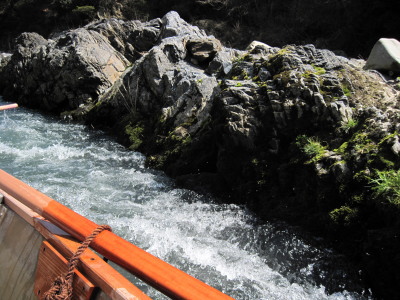 | 急な流れと落差がある所を舟は進んでいきます。このときは水しぶきが飛んできます。 |
