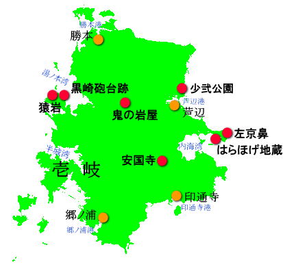 芦辺町/安国寺 芦辺町/左京鼻 芦辺町/はらほげ地蔵 芦辺町/少弐公園 芦辺町/鬼の岩屋 郷ノ浦町/黒崎砲台跡 郷ノ浦町/猿岩 |