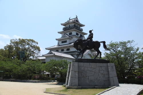 | 今治城天守閣と初代城主・藤堂高虎の銅像。 |