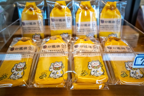 | 社務所で販売されている金色の印鑑袋。 |