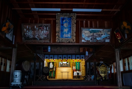 | 金富神社拝殿内の雰囲気。扁額には「八幡神社」と記されている。 |