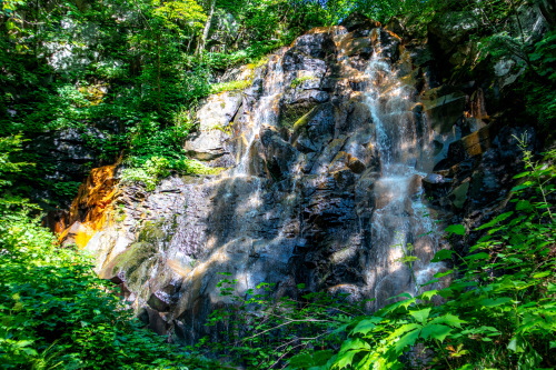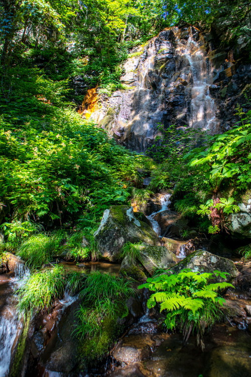 | 幻の滝は北塩原村から磐梯町を結ぶ「磐梯山ゴールドライン」の中腹からやや入った所にある滝で、駐車場から徒歩約5分程度で到着します。幻の滝は2007年に遊歩道と駐車場が整備されるまでは、地元の人にもあまり知られていなかったその名の通りの幻の滝で、茶色い岩壁を何段にもなって流れ落ちる滝の落差約13mあります。遊歩道を歩くと木立の中に突如として現われ、見頃の時期は4月下旬で雪解け水によって水量も多くなり、雄大な姿を見せてくれます。 |
