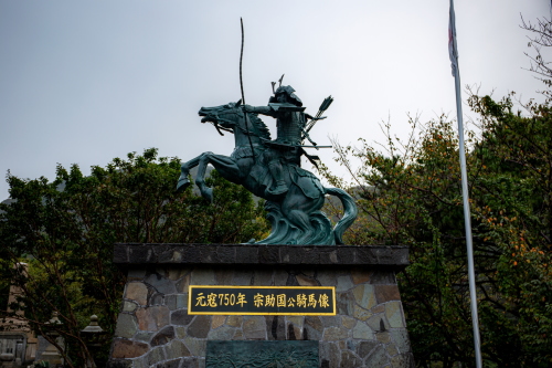| 小茂田浜神社境内にある元寇750年宗助国公騎馬像。 |