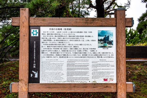対馬市の南西部・小茂田地区にある小茂田浜神社は、13世紀に中国大陸の国家・元の軍と朝鮮半島の国家である高麗の軍が攻めてきた「文永の役」で上陸してきた場所であり、主祭神である「宗助国」は文永の役の際に、900艘の艦船に分乗した3万人の元・高麗連合軍という大軍を相手に少数の兵で立ち向かい討ち死にした人物であり、「国難事変に際して神威を顕し命を賭して戦い、平時においては国家の平和を護り給う」神として祀られており、また元寇で戦死した将士の霊も祀られています。