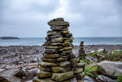 このヤクマの塔は祭りの後もそのまま残されており、木坂・御前浜には積まれた石の塔を見る事が出来ます。近くにある木坂の藻小屋と合わせて見学を。 |