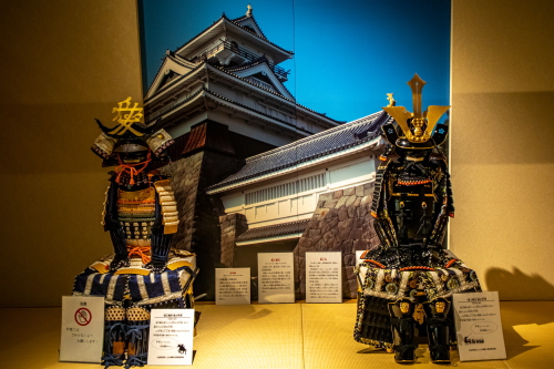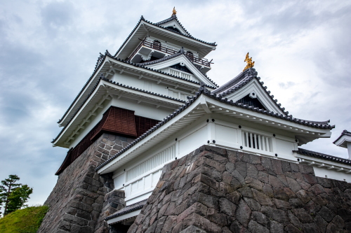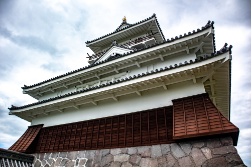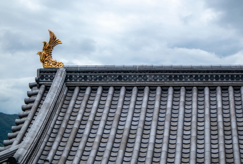 | 模擬天守である上山城天守閣の屋根瓦と金の鯱。 |