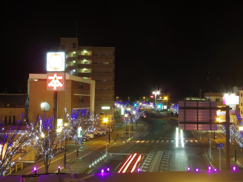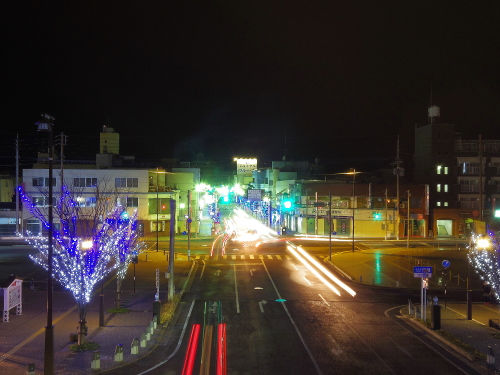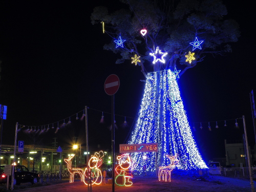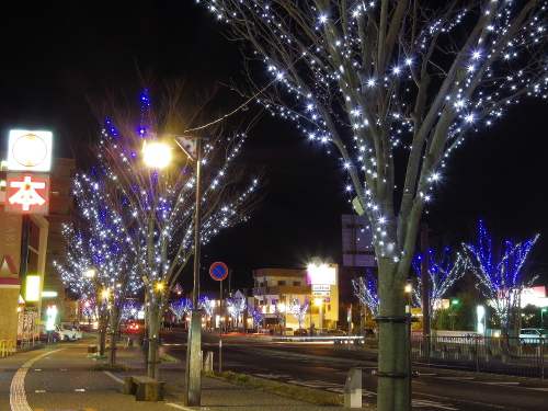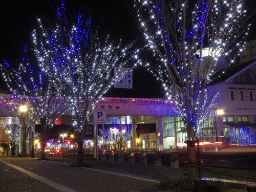 | 「輝けイマリフェスタ」と名づけられた伊万里駅周辺のイルミネーションは、伊万里駅前の通り・伊万里大通り沿いの街路樹にLEDの電飾で伊万里大通りの雰囲気を明るく変えてくれます。伊万里商工会議所青年部の若い人の力で、このイルミネーションは毎年開催されています。 |