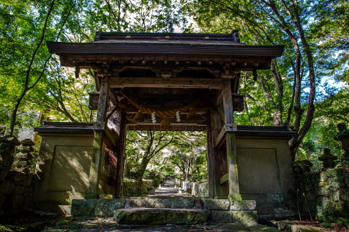 | 金剛力士像が建つ両子寺仁王門と石段の先に山門。 |