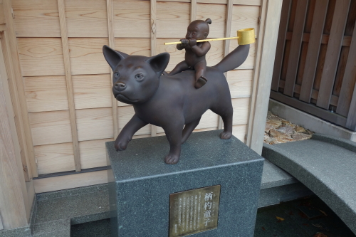 | 外宮参道にある柄杓童子。 古来より、神宮参詣(じんぐうさんけい)は人々のあこがれでしたが、実際にお参りにできないひとたちの願いを叶えてのが、犬の代参でした。柄杓を背にした犬が、たくさんの善意に守られながら道中を続けたといいます。犬にまたがっている童子は、優しい心の象徴です。 |