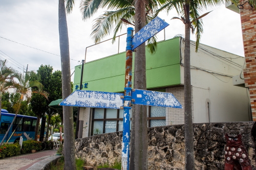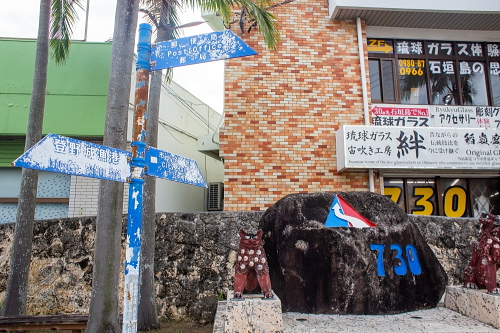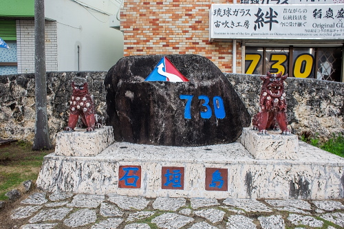 | 石垣市中心街の交差点には730記念碑が建てられてます。「730」とは7月30日を意味しており、米軍統治下の影響が残っていた為に、1978年7月30日に車輌の右側通行が本土と同じ左側通行に変更された日であり、前日の29日午後10時から変更当日の30日午前6時までの間、指定車両を除くすべての車両が通行禁止および駐車禁止になり、当日、午前6時にこれまでの右側通行から一転して左側通行へと移行しました。 それを記念して同年9月に「730記念碑」が交差点の側に設置されました。現在では撮影スポットとして観光客が立ち寄るエリアになっています。 |