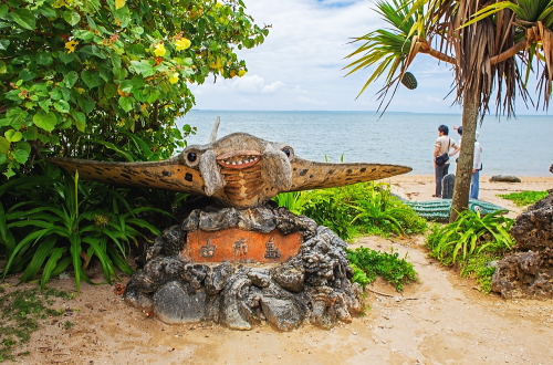 | 由布島は西表島の沖合に浮かぶ島で総面積0.15km・周囲は2.0kmの小さな島です。かつては人が住んでいましたが、台風の被害により壊滅的被害を受けて現在ではほぼ定住者がいない島になっています。島の人々が西表島へ移住する中、西表正治おじい夫婦は島に残り、再び島に人々が戻って来る事を信じてたくさんのヤシの木や花を植え続けていった事から、他の島では見られない亜熱帯植物が生い茂り、現在の亜熱帯植物楽園になっています。 現在、由布島の水牛は始祖、大五郎と花子の孫世代と曾孫世代が中心となって水牛車を引いています。次世代を担う子牛たちも続々と誕生しています。 |