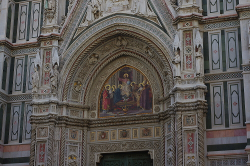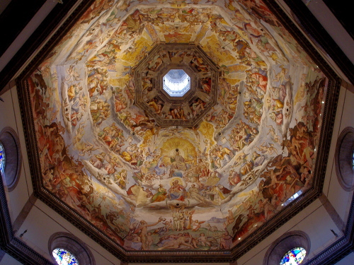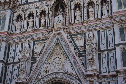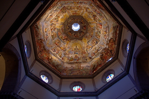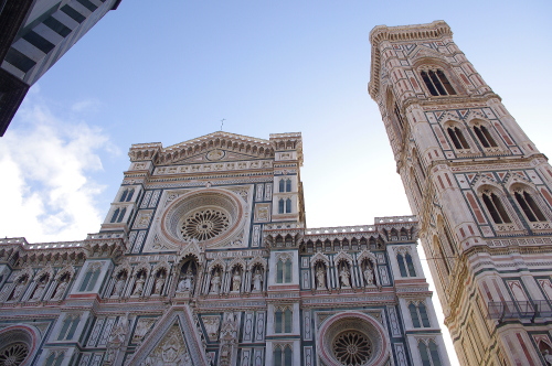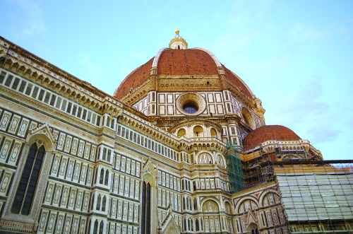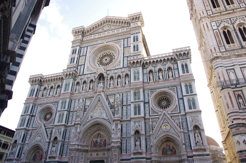 | フィレンツェの中心にあるサンタ・マリア・デル・フィオーレ大聖堂は、巨大なドームが特徴で、天蓋はイタリアにおける初期ルネサンス様式の建築物として、フィレンツェのシンボルになっています。石積み建築ドームとしては世界最大です。大聖堂の外壁は大理石を用いた混在様式の建築物で、聖堂の大きさとしては世界で4番目の大きさを誇ります。通称、フィレンツェのドゥオーモと呼ばれています。 |
