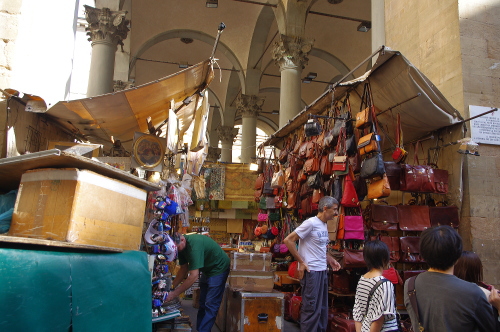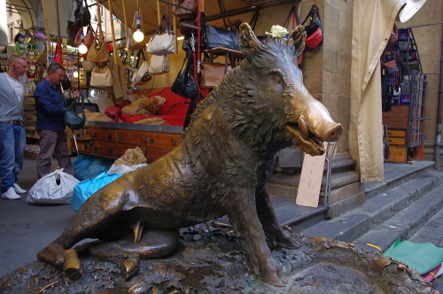 メルカート・ヌオーヴォは、革製品や紙製品など工芸品を販売している市場で、狭い敷地内に露店が並び、活気に溢れています。この市場の南側にはイノシシの像があり、このイノシシの鼻先に触るとフィレンツェに再び訪れる事が出来るというジンクスがあるらしいです。