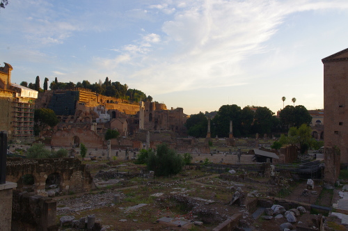 | フォロ・ロマーノは、古代ローマ時代の遺跡群でローマの観光地として観光客で賑わっているスポットです。かつてはローマ帝国の政治の中心地でしたが、東西分裂により土砂の下に埋もれたものです。19世紀から発掘がおこなわれ、現在発掘されているのは帝政以降のものが多いようです。 |