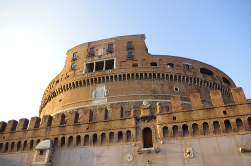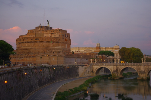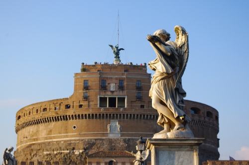 | サンタンジェロ城は、ローマ市内を流れるテヴェレ川沿いにあり、当初は135年に皇帝ハドリアヌスが建設を開始し、139年に完成した霊廟ですが、15世紀に教皇により要塞化されたものです。正面にはサンタンジェロ橋が架けられ、12体の天使の石像が並んでいます。 |
