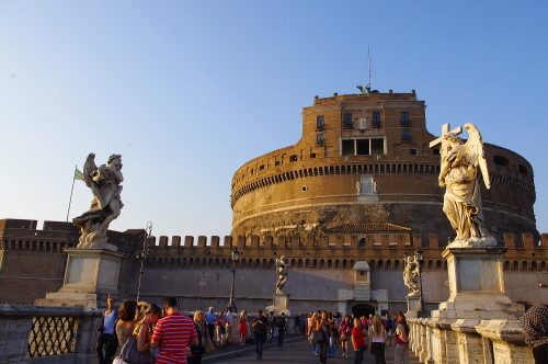 | サンタンジェロ橋にある天使の石像とサンタンジェロ城を見る。 |