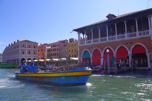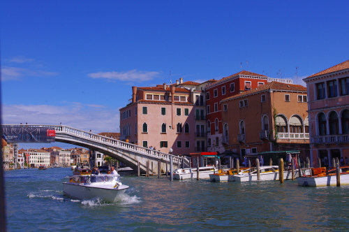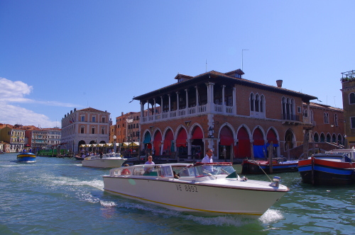 | ヴェネツィアは島々で構成されていて、各島内は運河があり、道の狭さから車の乗り入れが出来ない事もあって、ヴェネツィアの交通は船のみになっています。そのヴェネツィアの中心をS字の大運河が市街を二分して、この大運河が市内交通の大動脈になっているので、この大運河をたくさんの船舶が航行しています。 |
