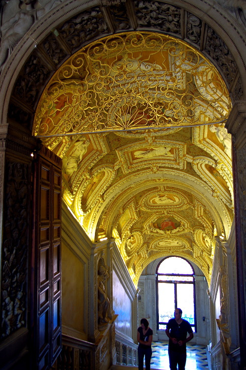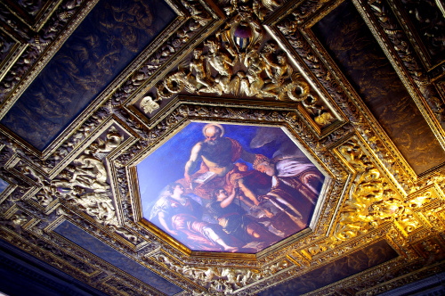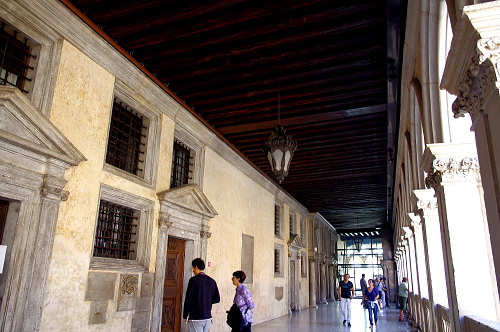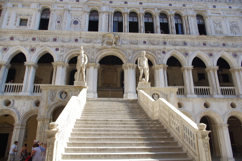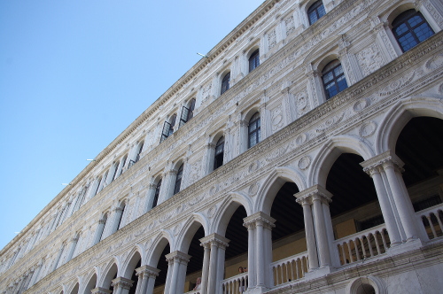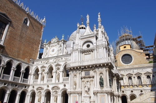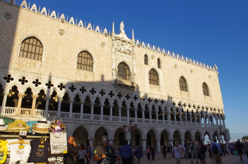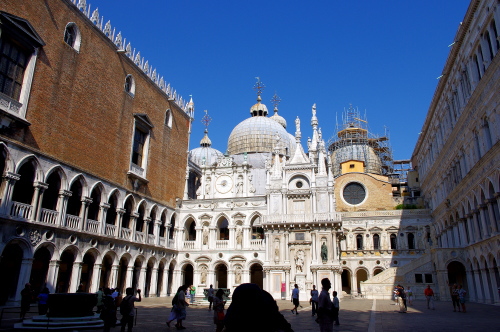 | サン・マルコ広場の南・小広場の目の前にあるドゥカーレ宮は、ヴェネツィア共和国の政治の中枢があった建物で、最高指揮官である総督の住まいとしても使われたものです。創建は9世紀で、その後改築などされて現在の形になった経緯になります。来賓が訪れる部屋などは非常に豪華な造りですが、そのほかの部屋は非常に質素に造られていて、来賓に対してヴェネツィアの権力を示した建物です。内部は撮影禁止。入場料:13ユーロ。 |