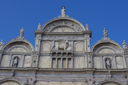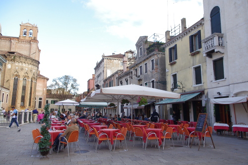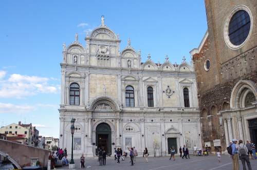 | サンディ・ジョヴァンニ・エ・パオロ教会は、ヴェネツィアのゴシック様式の教会としては最大の大きさで、13世紀から15世紀にかけて造られた教会です。広場はヴェネツィア市民の憩いの広場として、家族連れで遊んでいる人達が多い広場です。広場にはコッレオーニ将軍の騎馬像があり、隣には白色の建物である市民病院が並んでいます。 |