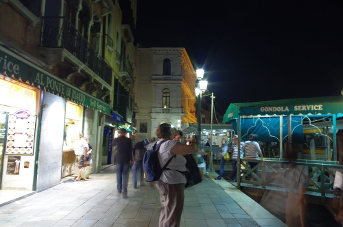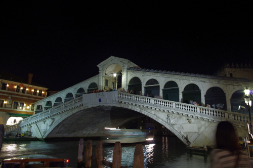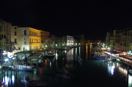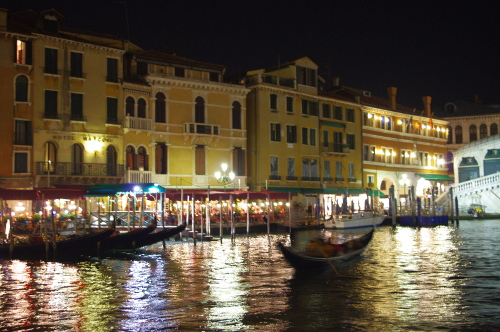 夜の大運河に架かるリアルト橋はライトアップされ、リアルト橋からはリアルトの街灯りと運河を航行する船の灯り・運河に映える街灯りと相まって美しい夜景を観賞できるスポットになります。夜景を観賞するたくさんの観光客で賑わっています。