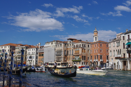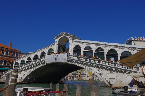 | リアルト橋は大運河に架かるシンボル的な存在の橋で、橋を中心にいろんな商店が並び、観光客で賑わっています。ヴェネツィアが海運国として栄えた13世紀に大運河に最初に架けられた橋で、完成当時は跳ね橋であったのですが、1592年にアントニオ・ダ・ポンテにより大理石に改装されたものです。橋の上にあるテラスからの眺めもよく、多くの観光客がテラスから眺めています。 |