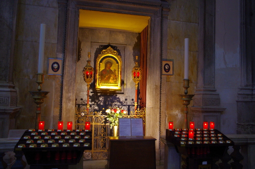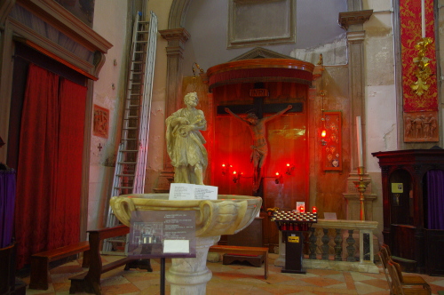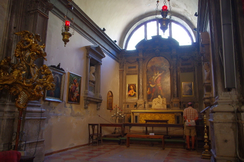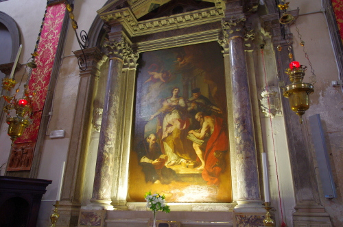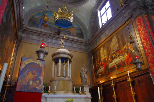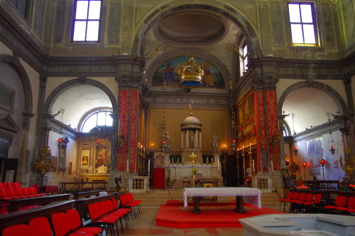 | サン・アポストーリ教会は、フランケッティ美術館から約10分弱で到着する事が出来る教会で、ガイドブックなどに一切記載されていない教会です。しかし、教会の内部は非常に美しい装飾で、近くを通ったら寄り道しても損はしない教会です。高い鐘楼が目印です。 |