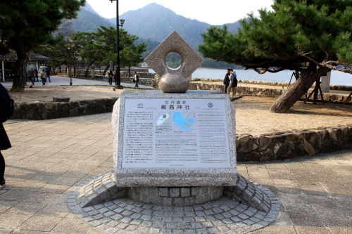 | 宮島桟橋近くにある「世界遺産・厳島神社」の石碑。 |