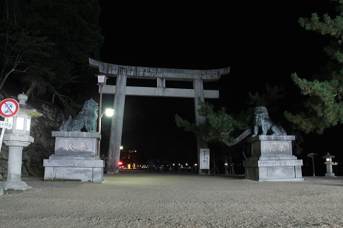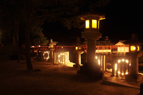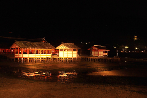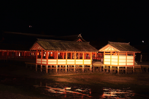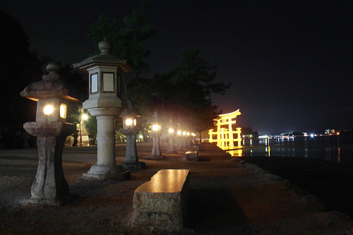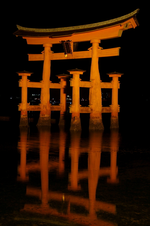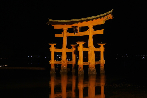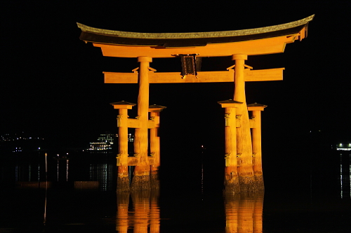 現在では6棟が1952年に国宝に指定され、美術品や他の建物は国の重要文化財に指定されており、1996年にはユネスコの世界遺産に登録されています。夜間は神社内に入る事はできませんが、大鳥居などがライトアップされており、神秘的な姿を見せてくれます。 |
