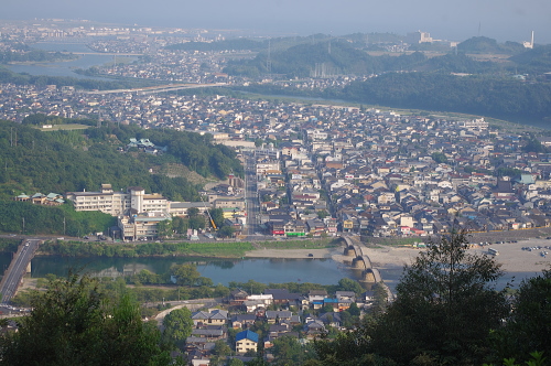 | ロープウェイ山頂駅にある展望スポットから岩国城下町を見下ろす。 |