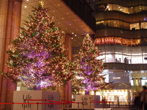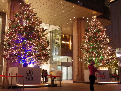 | 福岡の商業中心地・天神の一角をなす岩田屋本館前には、大分県九重町で育った本物のもみの木に、5万球のLED電飾された2本のクリスマスツリーが飾られています。様々な色に変化し、輝いている電球はとても美しく、たくさんの人がカメラで撮影をされていました。 点灯期間:2014年11月14日(金)〜2014年12月25日(木) 点灯時間:10:00〜23:00 |