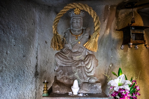 | 岩窟弁財天社・岩窟内に奉納されている弁財天石像。 |